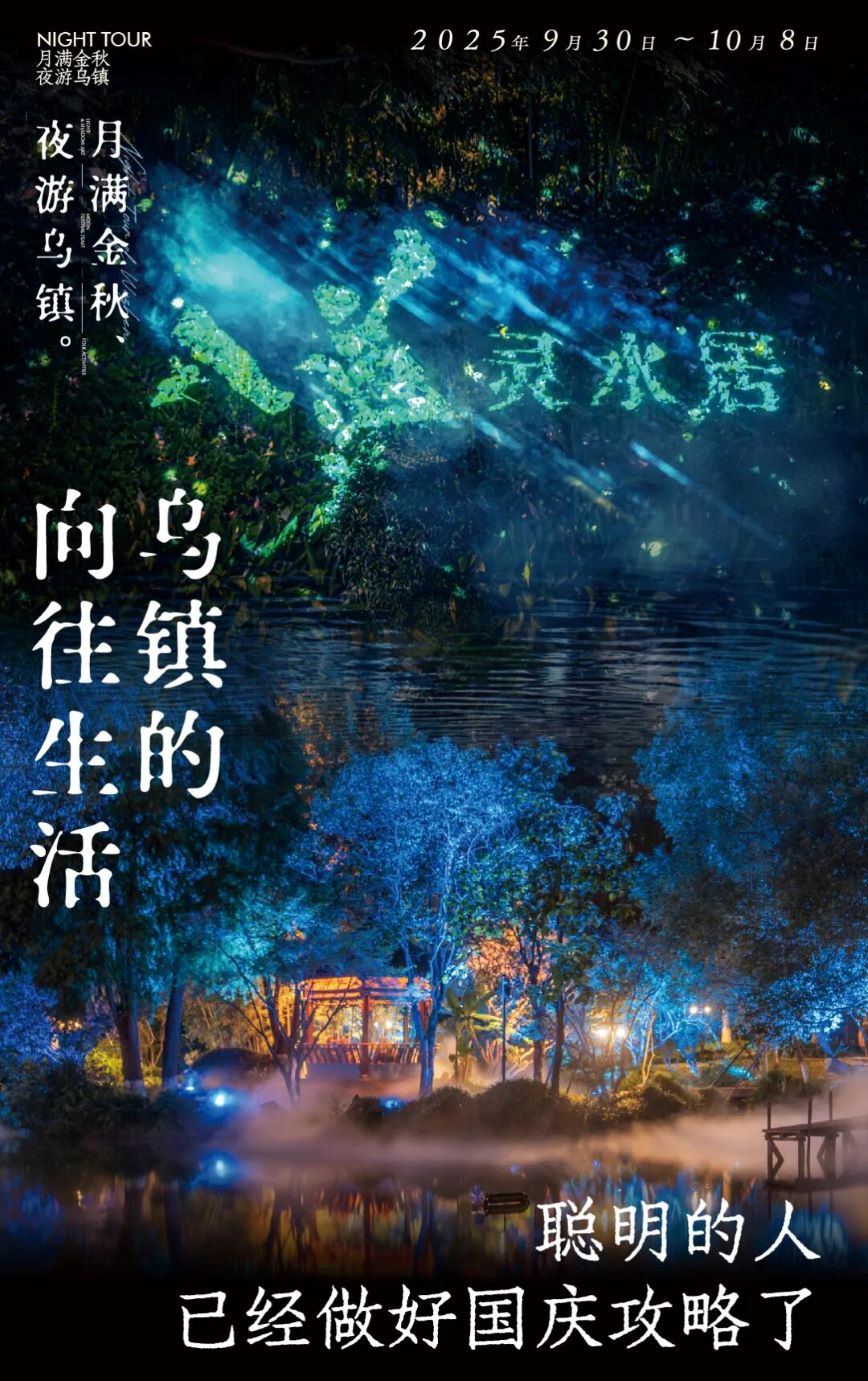 國慶,烏鎮(zhèn)上新! 黃昏漸沉,櫓聲暫歇 烏鎮(zhèn)西柵的靈水居卻悄然蘇醒 白墻黛瓦褪去日間的素雅 化身一場流動的光影夢境 《入夢靈水居》沉浸式光影秀 以光為筆,以水為墨 將江南園林繪成一首可步入的詩