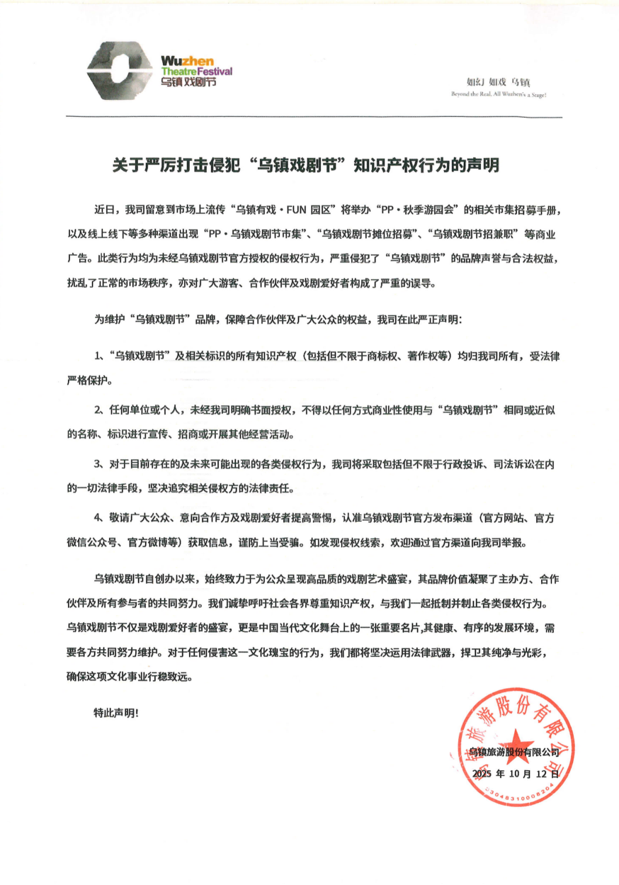 關(guān)于嚴(yán)厲打擊侵犯“烏鎮(zhèn)戲劇節(jié)”知識(shí)產(chǎn)權(quán)行為的聲明